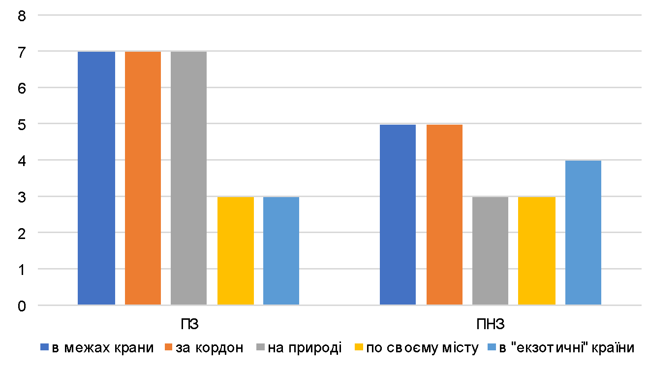 Таким чином, було виявлено, що серед ПЗ респондентів як варіант подорожей 7 осіб обрали "в межах країни", "за кордон" і "на природі", 3 особи – "по своєму місту" і "в "екзотичні" країни". Як спосіб подорожей 8 осіб обрали "літак", 5 – "пішки" і "автобус", 4 – "потяг" і "автівка". Жоден не обрав "велосипед або човен". У вподобаннях щодо оточення у подорожах 5 осіб воліли б самостійно подорожувати, 9 в парі. Результати представлено на рис. 1